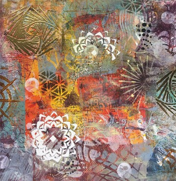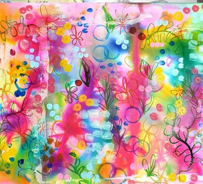 The process and result are so yummy I think of it as a layer cake stacked with celebratory goodness! Sometimes I leave my color-full layer cake as is or use it as collage material, but usually I use it as a background for more artwork.