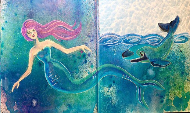 New ways to use watercolors, papers and a whole lot of wild art fun! How do we create a world for our mermaids to swim in? One way is to use Sea Sprays…