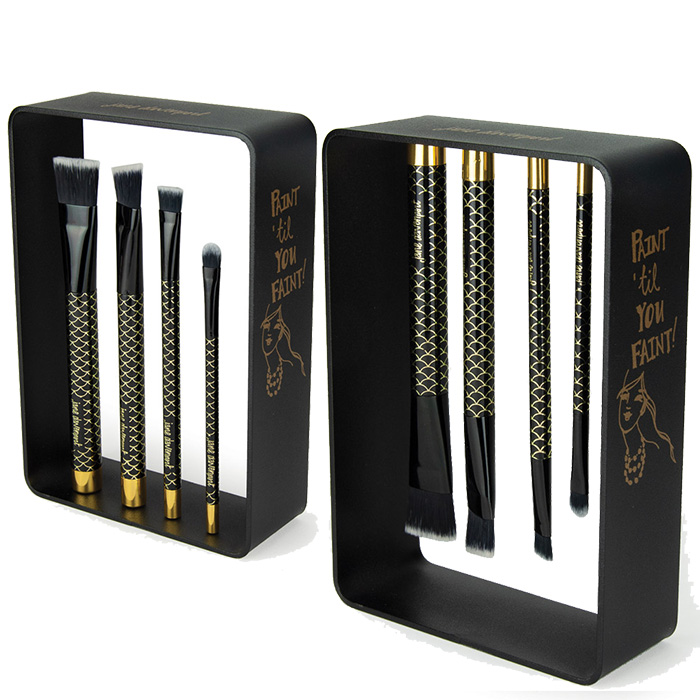 This gold-scale imprinted, magnetic brush set includes 4 brushes in a perfect range of sizes that easily store inside the metal cube.